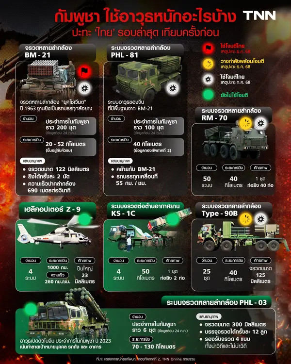 แม้รายงานจากฝ่ายความมั่นคงจะยืนยันการใช้จรวด BM-21 ของกัมพูชาแล้ว แต่จริง ๆ มีข้อมูลถึงการเคลื่อนอาวุธหนักเข้ามาประชิดชายแดน และเตรียมความพร้อมใช้โจมตีไทยด้วย ไม่ว่าจะ RM-70 และ Type-90B