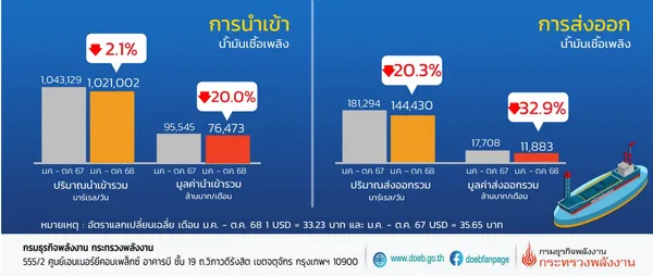 นั่นทำให้ตัวเลขการส่งออกของไทย ตามข้อมูลกระทรวงพลังงาน ชี้ว่า ไทยส่งออกน้ำมันช่วงเดือนมกราคม ถึง ตุลาคม ลดลงถึง 20.3% เมื่อเทียบกับเวลาเดียวกันปีที่แล้ว จากกว่า 181,000 บาร์เรลต่อวัน เหลือ 144,430 บาร์เรลต่อวัน เรียกว่ามูลค่าการส่งออกลดลงเกือบ 6 พันล้านบาททีเดียว