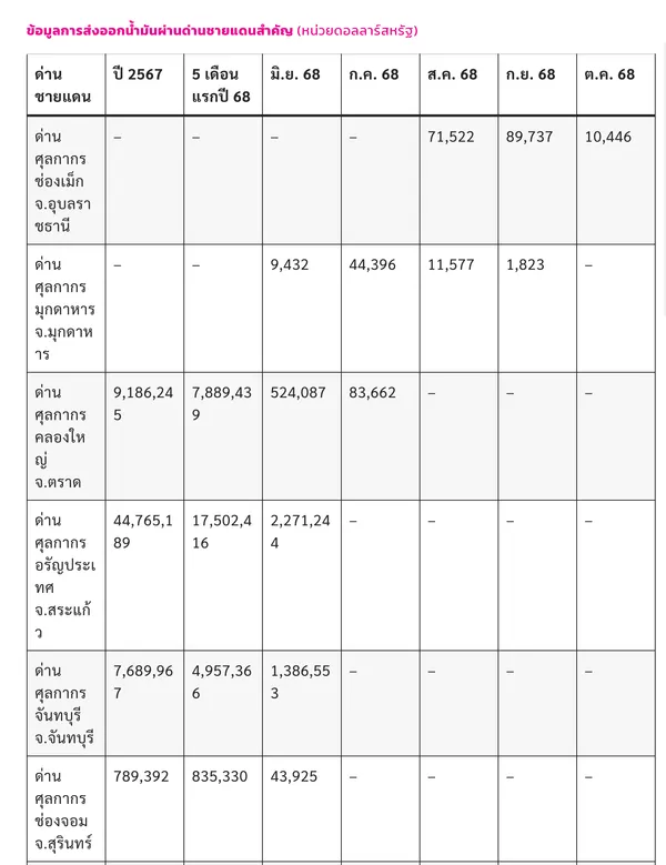 ในขณะที่การส่งออกน้ำมันตามแนวชายแดนติดกัมพูชาเงียบเหงา แต่ปริมาณส่งออกน้ำมันผ่านช่องเม็ก คึกคักขึ้น