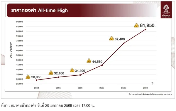 ซึ่งราคาทองโลกปรับตัวเพิ่มขึ้นกว่า 1,270 ดอลลาร์ หรือประมาณเกือบ 30% ทำ All-time High 5,595 ดอลลาร์ต่อทรอยออนซ์ ขณะที่ราคาทองคำแท่งในประเทศให้ผลตอบแทนสูงสุด 17,000 บาทต่อบาททองคำ ทำจุดสูงสุดในประวัติการณ์ที่ 81,950 บาทต่อบาททองคำ โดยใช้เวลาเพียง 29 วัน ก่อนเผชิญแรงขายอย่างรุนแรงกว่า 500 ดอลลาร์ ในคืนวันพฤหัสบดีที่ผ่านมา ก่อนสร้างความผันผวนอย่างต่อเนื่อง