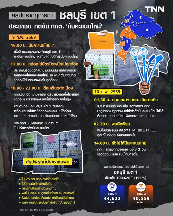 เรื่องมันเริ่มมาจากโพสต์ที่อ้างว่า ชลบุรีเขต 1 จะมีการนับคะแนนใหม่ ช่วงเย็นวันที่ 9 กุมภาพันธ์ แต่เมื่อประชาชนไปสังเกตการณ์ ไม่พบการนับคะแนน จึงติดตามไปดูหีบบัตรเลือกตั้ง พบว่า นำมารวมไว้ที่สนามแบดมินตัน