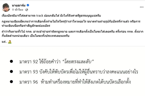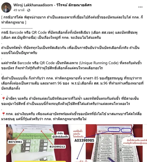 "เรื่องบัตรมีบาร์โค้ดสามารถ track ย้อนกลับได้ ยังไงก็ถึงศาลรัฐธรรมนูญแน่ครับ กฏหมายเขียนชัดเจนว่าการเลือกตั้งห้ามไม่ให้ใครรู้ว่าเราโหวตอะไร ขนาดห้ามถ่ายรูปกับบัตรที่กาแล้ว หรือการห้ามเขียนชื่อหรือทำสัญลักษณ์บนบัตร