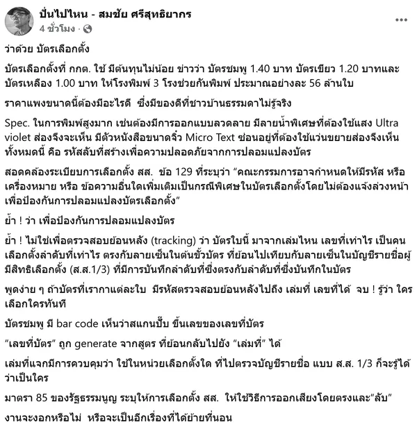 นายสมชัย ศรีสุทธิยากร อดีตกกต.โพสต์เฟซบุ๊ก โดยระบุว่า " ว่าด้วย บัตรเลือกตั้ง บัตรเลือกตั้งที่ กกต. ใช้ มีต้นทุนไม่น้อย ข่าวว่า บัตรชมพู 1.40 บาท บัตรเขียว 1.20 บาทและ บัตรเหลือง 1.00 บาท ให้โรงพิมพ์ 3 โรงช่วยกันพิมพ์ ประมาณอย่างละ 56 ล้านใบ ราคาแพงขนาดนี้ต้องมีอะไรดี ซึ่งมีของดีที่ชาวบ้านธรรมดาไม่รู้จริง