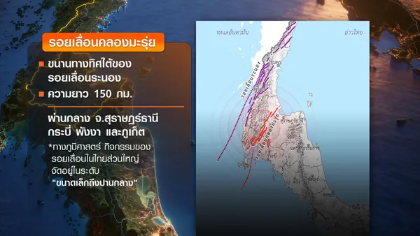 GISTDA สำนักงานพัฒนาเทคโนโลยีอวกาศและภูมิสารสนเทศ (องค์การมหาชน) โพสต์ตามแกะรอย "สั่นสะเทือน" ใต้พื้นพิภพด้ามขวานของไทย สุราษฎร์ธานี และ 2 รอยเลื่อนยักษ์ผู้หลับใหล (แต่ไม่สนิท) แผ่นดินไหวในครั้งนี้ ซึ่งมีด้วยกัน 2 รอยเลื่อน ได้แก่ รอยเลื่อนระนอง และ รอยเลื่อนคลองมะรุ่ย