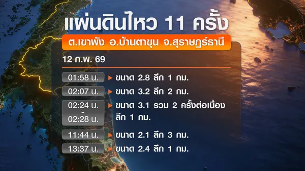 02:24 - 02:28 น.: ขนาด 3.1 รวม 2 ครั้งต่อเนื่อง ลึก 1 กม.