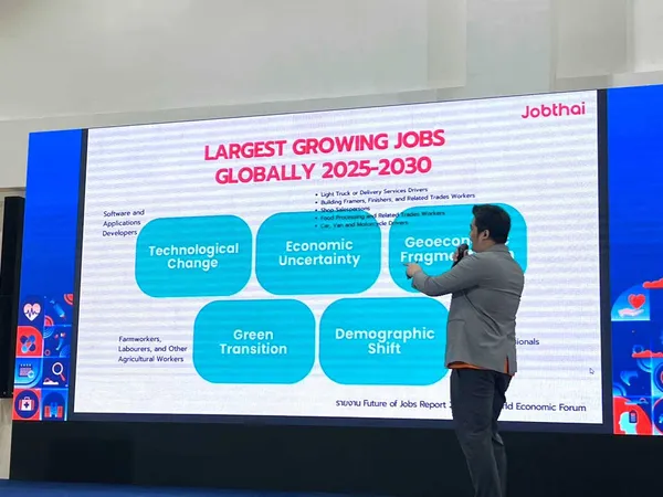 รัฐชล คงวัฒนกุล Content Creator แผนก Marketing บริษัทจัดหางาน จ๊อบไทย จำกัด (Jobthai) ให้ข้อมูลในงานCRA Job Fair & Education 2026 เมื่อเร็วๆ นี้ อ้างอิงจากรายงาน Future of Jobs Report 2025 โดย World Economic Forum ซึ่ง นำเสนอโดย Jobthai พบว่าปัจจัยที่ทำให้ความต้องการแรงงานเปลี่ยนไป ได้แก่ การเปลี่ยนแปลงทางเทคโนโลยี, ความไม่แน่นอนทางเศรษฐกิจ, การแบ่งขั้วทางเศรษฐกิจและภูมิศาสตร์การเมือง, การเปลี่ยนผ่านสู่เศรษฐกิจสีเขียว, การเปลี่ยนแปลงทางโครงสร้างประชากร เช่น สังคมสูงวัย เป็นต้น