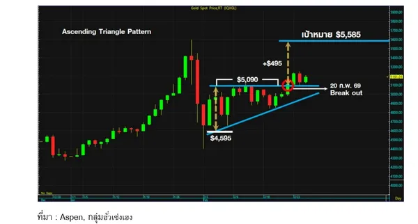 ราคาทองคำทางด้านเทคนิคในเดือนกุมภาพันธ์อยู่ในช่วงของการปรับฐาน และมีการเคลื่อนไหวในรูปแบบสามเหลี่ยมขาขึ้น (Ascending Triangle) จุดต่ำสุดยกสูงขึ้น แต่จุดสูงสุดหรือแนวต้านเป็นเส้นแนวนอนอยู่ที่ 5,090-5,100 ดอลลาร์ ซึ่งเป็นแนวต้านที่ขึ้นไปทดสอบหลายครั้งไม่สามารถผ่านขึ้นได้ ในที่สุดวันศุกร์ที่ 20 กุมภาพันธ์ราคาทองสามารถทะลุแนวต้าน 5,090-5,100 ดอลลาร์ได้ ทำให้คาดว่าราคาทองคำจะปรับขึ้นได้ราว 495 ดอลลาร์ เป้าหมายราคาทองคำอยู่ที่ 5,585 ดอลลาร์ ราคาทองไทย 81,350 บาท ขณะที่นอกจากประเด็นความไม่แน่นอนภาษีทรัมป์ที่กล่าวมาข้างต้นแล้ว บทสรุปการเจรจานิวเคลียร์ระหว่างสหรํฐฯ - อิหร่าน ก็เป็นอีกหนึ่งปัจจัยสำคัญที่ต้องติดตามเช่นกัน