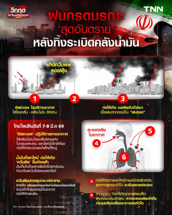 เมฆหมอกครึ้มทะมึนทั่วเมือง ฝนกลายเป็นสีดำ กลิ่นคลุ้งของสารเคมี นี่คือภาพที่เกิดขึ้นในกรุงเตหะราน เมืองหลวงของอิหร่าน หลังกองทัพอิสราเอลระบุว่าได้โจมตีคลังเก็บเชื้อเพลิงหลายแห่งในกรุงเตหะราน เมื่อวันที่ 8 มีนาคม ที่ผ่านมา