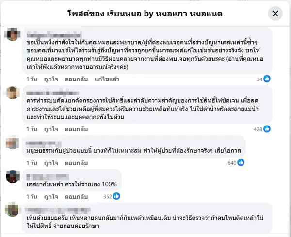คนที่เห็นใจหมอส่วนหนึ่งมองว่า ประเด็นนี้ไม่ใช่การเกลียดคนไข้ แต่เป็นการพูดถึงความจริงหน้างาน ว่าทรัพยากรมีจำกัด และบุคลากรทางการแพทย์ต้องตัดสินใจอยู่ตลอดเวลาในสภาพที่กดดันมาก