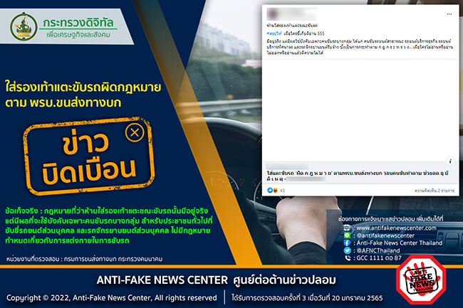 วันนี้ (20 ม.ค.65) ศูนย์ต่อต้านข่าวปลอม ประเทศไทย Anti-Fake News Center Thailand ระบุว่า ตามที่มีข่าวปรากฏในสื่อต่างๆ เกี่ยวกับประเด็นเรื่อง ใส่รองเท้าแตะขับรถผิดกฎหมายตาม พ.ร.บ.ขนส่งทางบก ทางศูนย์ต่อต้านข่าวปลอมได้ดำเนินการตรวจสอบข้อเท็จจริงกับ กรมการขนส่งทางบก กระทรวงคมนาคม พบว่าประเด็นดังกล่าวนั้น "เป็นข้อมูลบิดเบือน"