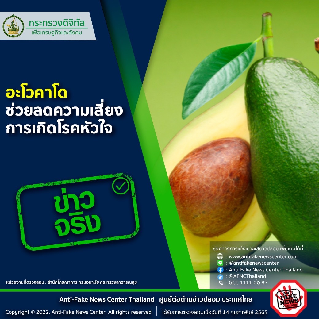 กรณีที่มีการเผยแพร่ข้อมูลในสื่อสังคมออนไลน์ประเด็นเรื่อง อะโวคาโดช่วยลดความเสี่ยงการเกิดโรคหัวใจ ทางศูนย์ต่อต้านข่าวปลอม กระทรวงดิจิทัลเพื่อเศรษฐกิจและสังคม ได้ดำเนินการตรวจสอบข้อเท็จจริงโดย สำนักโภชนาการ กรมอนามัย กระทรวงสาธารณสุข พบว่าประเด็นดังกล่าวนั้น เป็นข้อมูลจริง