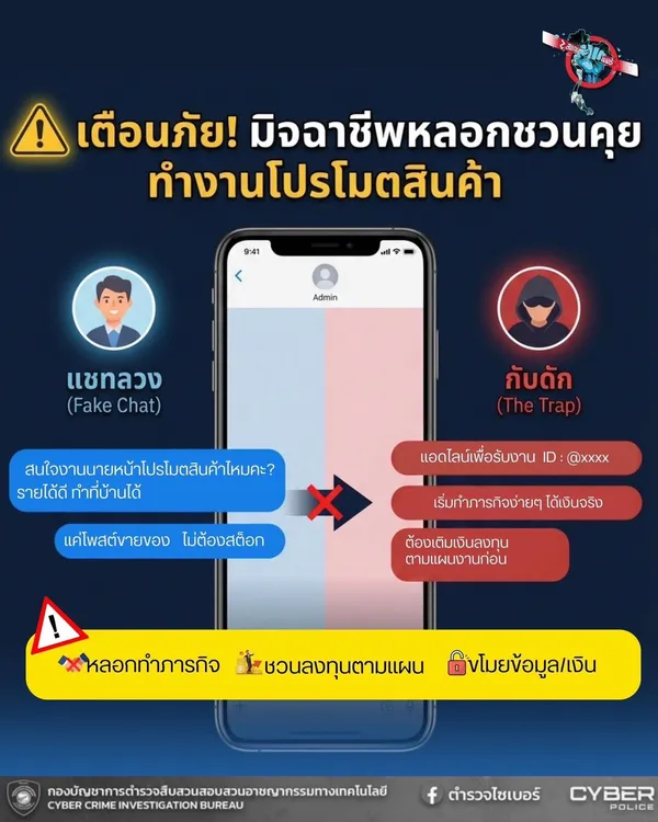 มิจฉาชีพมามุกใหม่ หลอกชวนคุย ทำงานโปรโมตสินค้า หารายได้ สุดท้ายอาจหมดตัว เรื่องนี้เป็นข้อมูลจริง กองบัญชาการตำรวจสืบสวนสอบสวนอาชญากรรมทางเทคโนโลยี (ตำรวจไซเบอร์) ได้แชร์ข้อมูล ผ่านเพจเฟซบุ๊ก ตำรวจไซเบอร์ - บช.สอท. 1 เกี่ยวกับประเด็นดังกล่าว โดยระบุว่าใครกำลังหางานเสริม หรือเจอแชททักมาแบบนี้ ระวังไว้เลย! อย่าเพิ่งดีใจว่าเจองานสบาย รายได้ดี เพราะคุณอาจกำลังคุยกับมิจฉาชีพ