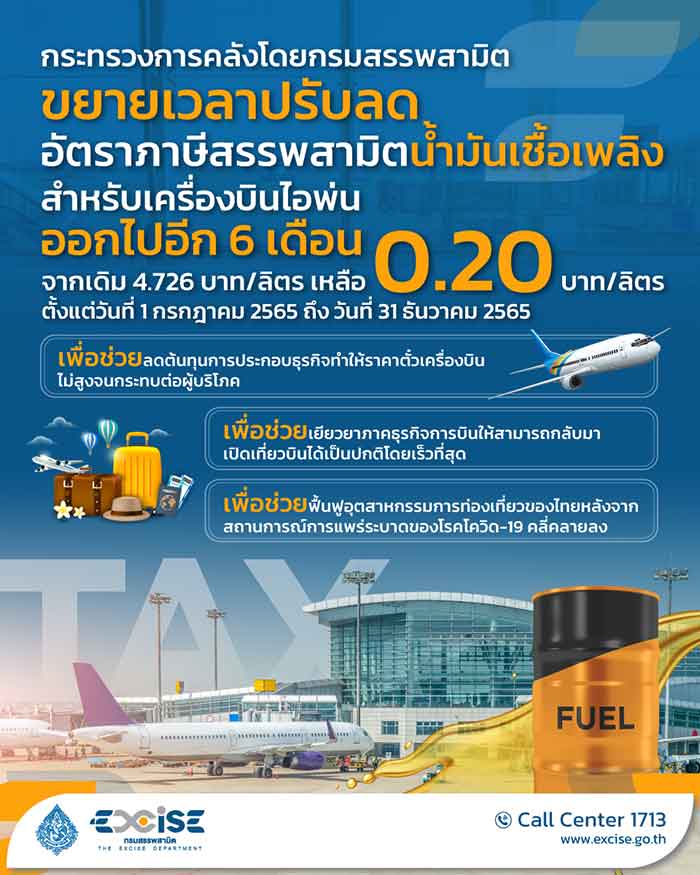 คณะรัฐมนตรีได้มีมติเห็นชอบ ตามข้อเสนอของกระทรวงการคลังขยายเวลาการปรับลดอัตรา ภาษีสรรพสามิตน้ำมัน เชื้อเพลิงสำหรับเครื่องบินไอพ่นที่ใช้ในประเทศเหลือลิตรละ 0.20 บาท ออกไปจนถึงวันที่ 31 ธันวาคม 2565 เพื่อสนับสนุนอุตสาหกรรมท่องเที่ยวของไทยให้ช่วยขับเคลื่อนเศรษฐกิจของประเทศให้กลับมาขยายตัวได้อย่างต่อเนื่อง