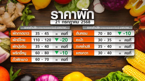 กระทรวงพาณิชย์รายงานราคาผักค้าปลีกประจำวันที่ 21 กรกฎาคม 2568 พบว่าผักหลายชนิดยังคงมีราคาทรงตัว แต่มีบางรายการที่ราคาปรับลดลงชัดเจน โดยเฉพาะ ผักชีไทย ซึ่งลดลงมากถึง 20 บาทต่อกิโลกรัม และ พริกขี้หนู รวมถึง ต้นหอม ที่ปรับลดลงอีก 10 บาทต่อกิโลกรัม