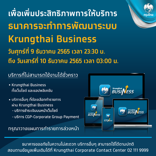 แจ้งว่า เพื่อเพิ่มประสิทธิภาพการให้บริการ ธนาคารจะทำการพัฒนาระบบ Krungthai Business ใน วันศุกร์ที่ 9 ธันวาคม 2565 เวลา 23:30 น.ถึง วันเสาร์ที่ 10 ธันวาคม 2565 เวลา 03:00 น. กรุณาวางแผนการทำรายการล่วงหน้า ธนาคารขออภัยในความไม่สะดวก บริการอื่นๆ สามารถใช้ได้ตามปกติ