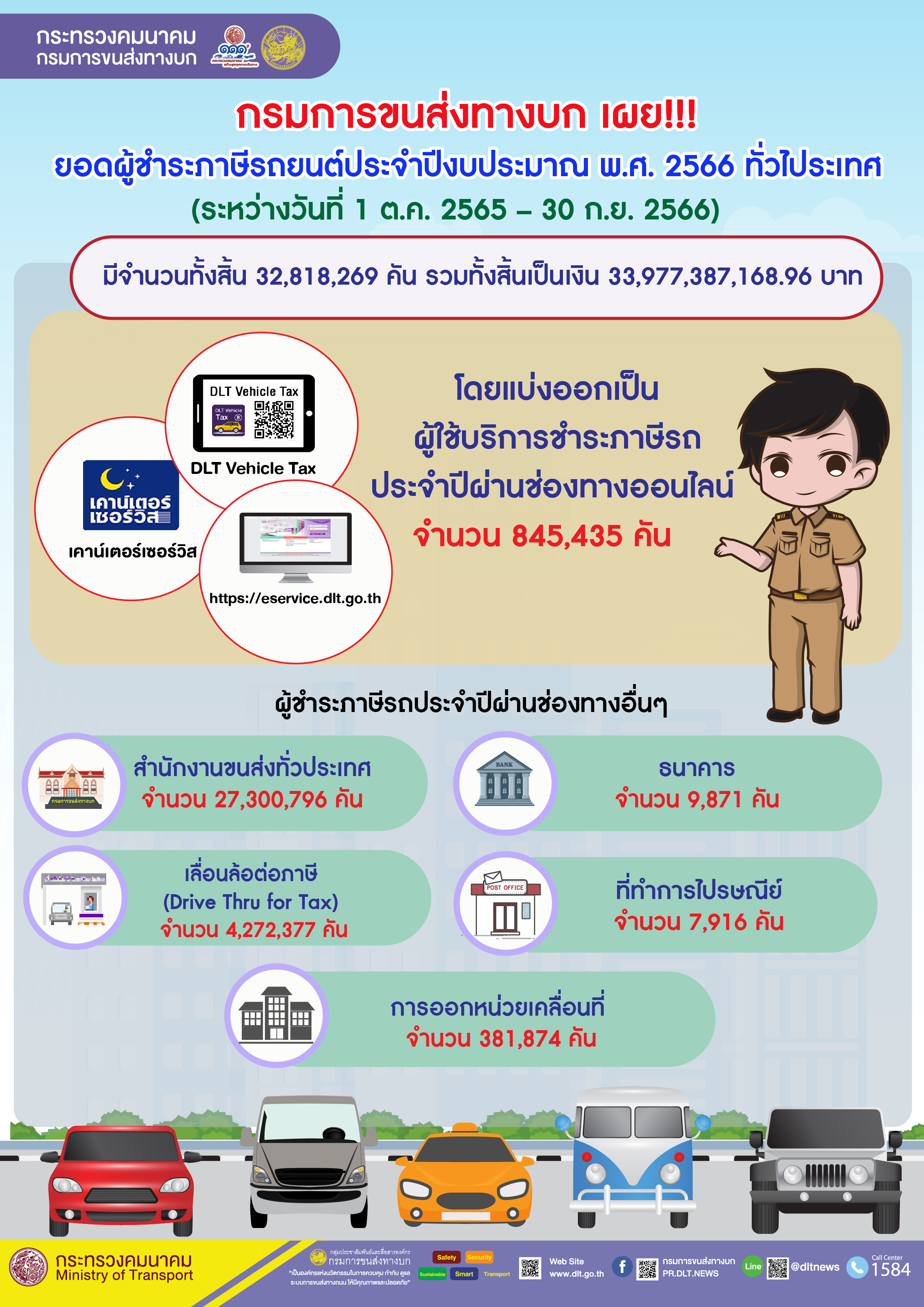 แบ่งออกเป็นผู้ใช้บริการชำระภาษีรถประจำปีออนไลน์ (แอปพลิเคชัน DLT Vehicle Tax เว็บไซต์ https://eservice.dlt.go.th และเคาน์เตอร์เซอร์วิส) 845,435 คัน การใช้บริการรับชำระภาษีรถประจำปี ณ สำนักงานขนส่งทั่วประเทศ 27,300,796 คัน การใช้บริการเลื่อนล้อต่อภาษี (Drive Thru for Tax) 4,272,377 คัน การออกหน่วยเคลื่อนที่ 381,874 คัน ที่ทำการไปรษณีย์ 7,916 คัน ชำระผ่านธนาคาร 9,871 คัน