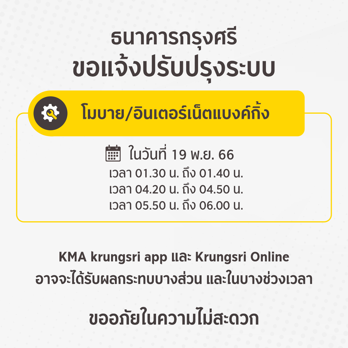 ขอแจ้งปรับปรุง โมบาย/อินเทอร์เน็ตแบงก์กิ้ง ชั่วคราว เพื่อทำการปรับปรุงระบบ ในวันที่ 19 พ.ย. 66
