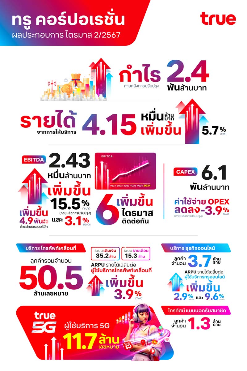 บริษัท ทรู คอร์ปอเรชั่น จำกัด (มหาชน) รายงานผลประกอบการไตรมาส 2 ปี 2567 ด้วยกำไรที่ต่อเนื่อง โดยมีกำไรสุทธิหลังหักภาษีและหลังปรับปรุงรายการพิเศษ 2.4 พันล้านบาท EBITDA เติบโตเป็นไตรมาสที่ 6 ติดต่อกัน เป็นผลจากรายได้ที่เพิ่มขึ้นจากธุรกิจโทรศัพท์เคลื่อนที่และธุรกิจออนไลน์ ขณะที่ค่าใช้จ่ายในการดำเนินงานลดลงจากการให้ความสำคัญกับผลการดำเนินงานและการเพิ่มประสิทธิภาพ บริษัทยังคงย้ำถึงการปรับเปลี่ยนสู่การเป็นบริษัทโทรคมนาคม-เทคโนโลยีชั้นนำ โดยมุ่งเน้นการประยุกต์ใช้ AI และการทำให้กระบวนการทำงานเป็นระบบอัตโนมัติตามเป้าหมายภายในปี 2570