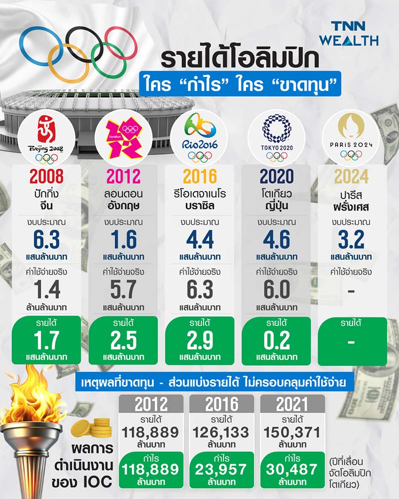 เมื่อมองย้อนกลับมาที่คณะกรรมการโอลิมปิกสากล ซึ่งเป็นคนคอยจัดการแข่งขัน และจัดหารายได้กันบ้าง กลายเป็นว่าจากกีฬาโอลิมปิกที่จัดขึ้นทุก 4 ปีกลับได้กำไรเกือบทุกปีที่มีการจัดงานกีฬาโอลิมปิก โดยผลการดำเนินงานของ IOC ในปีที่มีการจัดโอลิมปิก จะพบว่า ปี 2012 มีรายได้ 118,889 ล้านบาท กำไร 30,197 ล้านบาท ปี 2016 มีรายได้ 126,133 ล้านบาท กำไร 23,957 ล้านบาท ปี 2021 (ปีที่เลื่อนจัดโอลิมปิกโตเกียว) มีรายได้ 150,371 ล้านบาท กำไร 30,487 ล้านบาท