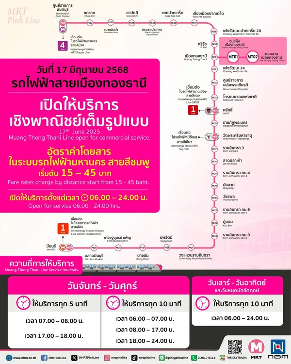 ล่าสุด การรถไฟฟ้าขนส่งมวลชนแห่งประเทศไทย แจ้งว่า ตั้งแต่วันที่ 17 มิถุนายน 2568 เป็นต้นไป รถไฟฟ้าสายเมืองทองธานี เปิดให้บริการเชิงพาณิชย์เต็มรูปแบบ อัตราค่าโดยสารในระบบรถไฟฟ้ามหานคร สายสีชมพู เริ่มต้น 15 – 45 บาท เวลาให้บริการ ตั้งแต่เวลา 06.00 – 24.00 น.