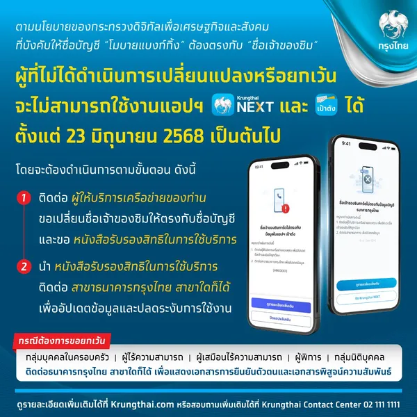 ธนาคารกรุงไทย แจ้งว่า ตามนโยบายของกระทรวงดิจิทัลเพื่อเศรษฐกิจและสังคม ที่บังคับให้ชื่อบัญชี “โมบายแบงก์กิ้ง” ต้องตรงกับ “ชื่อเจ้าของซิม” ใน ลูกค้ากลุ่ม Phase 1 ที่ได้รับ Notification ตั้งแต่วันที่ 23 มิถุนายน 2568 เป็นต้นไป ผู้ที่ไม่ได้ดำเนินการเปลี่ยนแปลงหรือยกเว้น จะไม่สามารถใช้งานแอปฯ Krungthai NEXT และ เป๋าตัง ได้