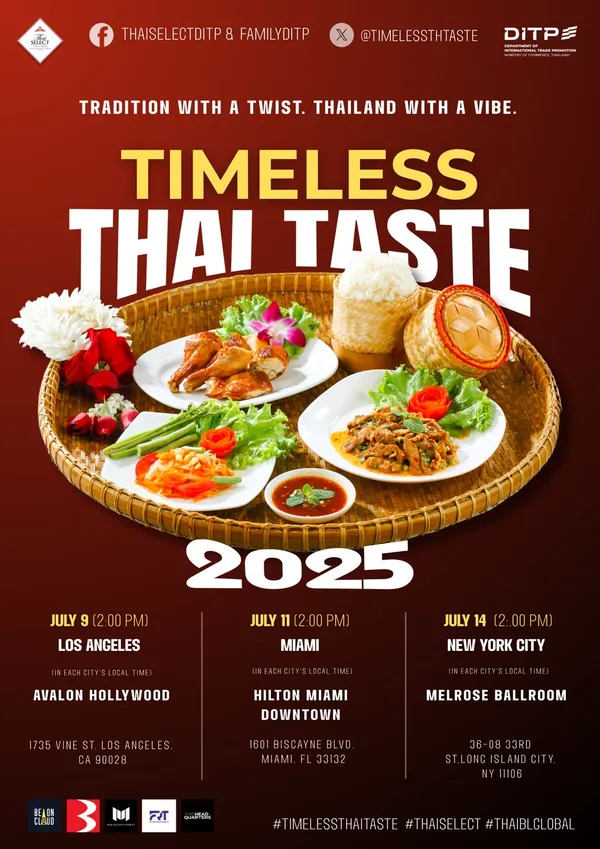 กรมส่งเสริมการค้าระหว่างประเทศ (DITP) กระทรวงพาณิชย์ เตรียมจัดกิจกรรม “Timeless Thai Taste 2025” ระหว่างวันที่ 9–14 กรกฎาคม 2568 ใน 3 เมืองสำคัญของสหรัฐอเมริกา ได้แก่ ลอสแอนเจลิส ไมอามี และนิวยอร์ก เดินหน้าส่งเสริมการรับรู้และขยายตลาดสินค้าและบริการด้านวัฒนธรรมไทย ด้วยจุดแข็งของอาหารไทยที่ได้รับการรับรองด้วยตรา Thai SELECT ควบคู่กับกระแสนิยมของซีรีส์วายไทยในการสื่อสาร Soft Power อย่างสร้างสรรค์สู่ผู้บริโภคกลุ่มใหม่ในตลาดโลก