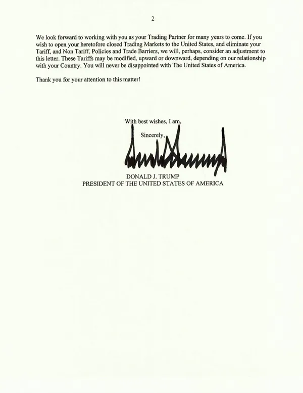 เนื้อหาในจดหมายดังกล่าวระบุว่า อัตราภาษีใหม่นี้มีความจำเป็นเพื่อแก้ไขการขาดดุลการค้าระหว่างสหรัฐฯ กับทั้ง 14 ประเทศ ขณะเดียวกันจดหมายที่ประธานาธิบดีทรัมป์ลงนามยังระบุเพิ่มเติมว่า สหรัฐฯ "อาจจะ" พิจารณาปรับระดับภาษีใหม่ "โดยขึ้นอยู่กับความสัมพันธ์ของเรากับประเทศของคุณ"