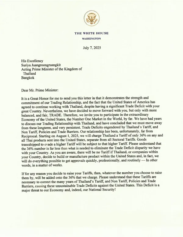 วันนี้ (8 ก.ค.2568) โดนัลด์ ทรัมป์ ประธานาธิบดีสหรัฐอเมริกา ได้โพสต์หนังสือผ่าน Truth Social ที่ส่งถึงประเทศต่างๆ รวมถึงประเทศไทย เพื่อแจ้งอัตราภาษี โดยประเทศต่าง ๆ อย่างน้อย 14 ประเทศจะถูกเรียกเก็บภาษีศุลกากรตั้งแต่วันที่ 1 ส.ค. โดยจะมีบางประเทศถูกเรียกเก็บภาษีในอัตราที่สูงขึ้น สำหรับประเทศไทยจะถูกเรียกเก็บภาษีในอัตรา 36% ไม่เปลี่ยนแปลงจากที่ได้ประกาศไว้เมื่อวันที่ 2 เม.ย.