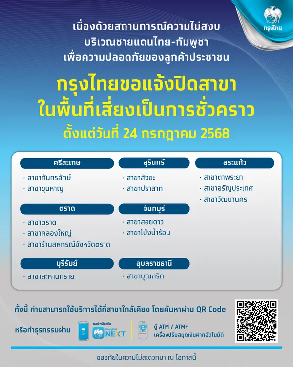 เนื่องจากสถานการณ์ความไม่สงบ บริเวณชายแดนไทย-กัมพูชา ธนาคารขอแจ้งปิดบริการสาขาในพื้นที่เสี่ยงเป็นการชั่วคราว ตั้งแต่วันที่ 24 กรกฎาคม 2568 เป็นต้นไป