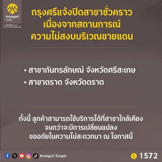 ธนาคารกรุงศรีอยุธยา แจ้งปิดสาขาชั่วคราว เนื่องจากสถานการณ์ความไม่สงบบริเวณชายแดน