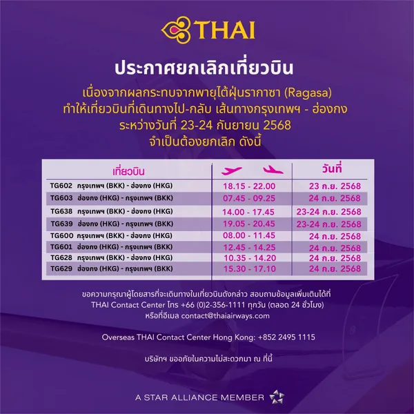 บริษัท การบินไทย จำกัด (มหาชน) ขอแจ้งยกเลิกเที่ยวบินระหว่างกรุงเทพฯ – ฮ่องกง จากสถานการณ์พายุไต้ฝุ่น “รากาซา (RAGASA)” ดังนี้