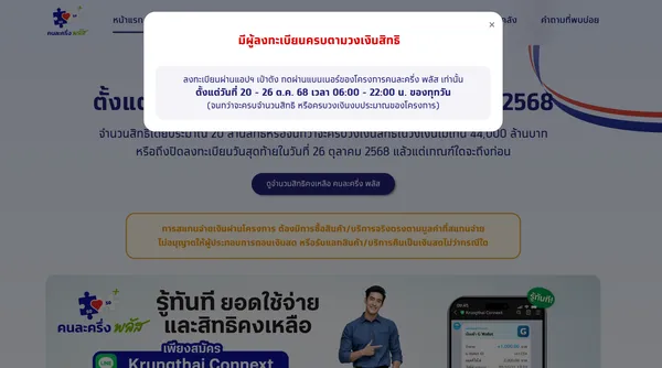 ภายหลังจากเปิดระบบให้ประชาชนลงทะเบียน คนละครึ่ง พลัส จำนวน 20 ล้านสิทธิ์ ตั้งแต่ 06.00 น. วันที่ 20 – 26 ตุลาคม 2568 และเริ่มใช้สิทธิ์ได้ตั้งแต่วันที่ 29 ตุลาคม – 31 ธันวาคม 2568