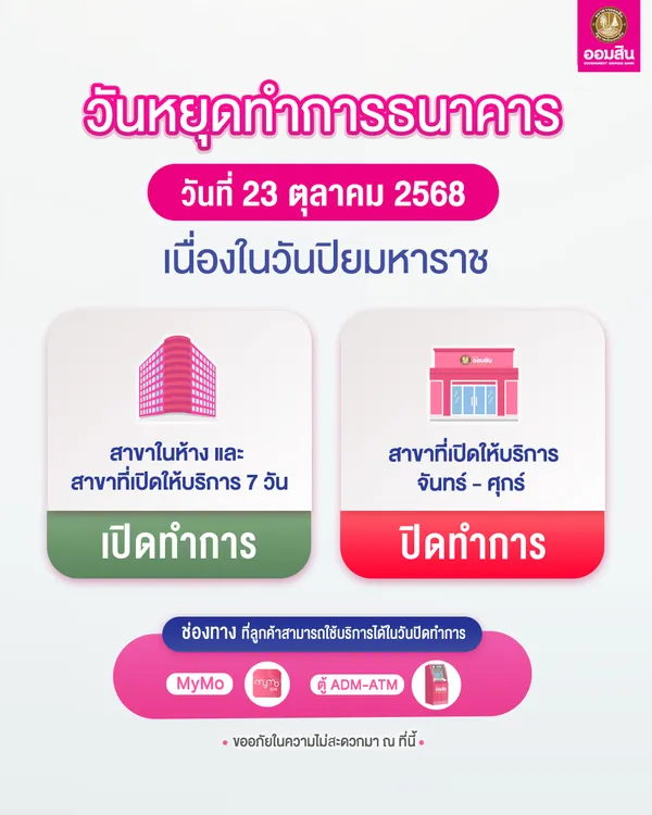 แจ้งวันหยุดทำการธนาคารออมสิน วันที่ 23 ตุลาคม 2568 เนื่องในวันปิยมหาราช