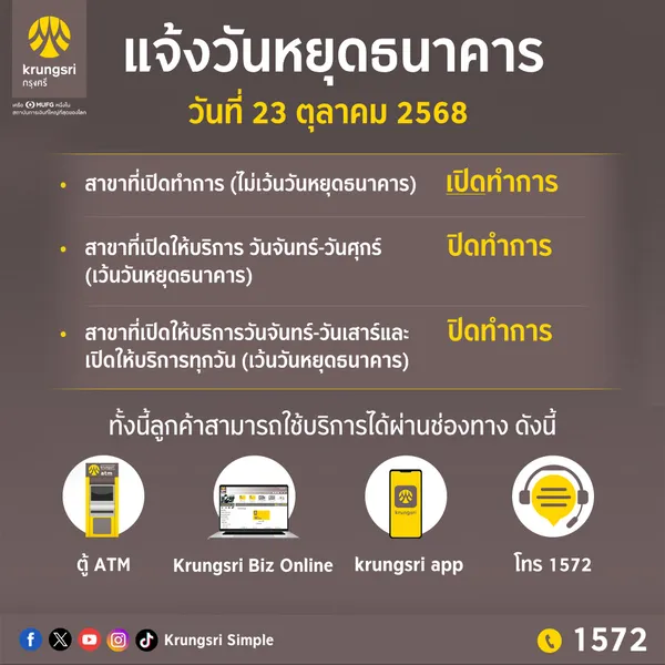 - สาขาทั่วไป ปิดทำการในวันที่ 13 และ 23 ตุลาคม ปี 68