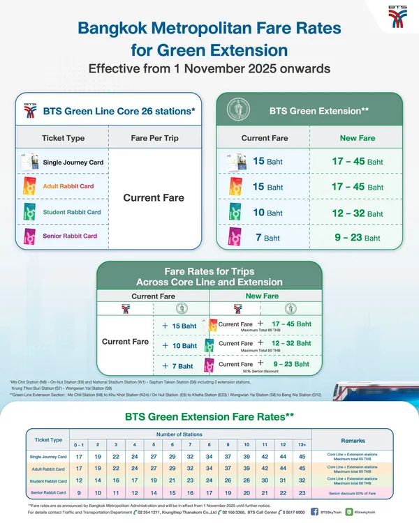 จากกรณีที่กรุงเทพมหานคร (กทม.) เตรียมปรับโครงสร้างอัตราค่าโดยสารโครงการรถไฟฟ้าสายสีเขียวในส่วนต่อขยายทั้งสามช่วง ได้แก่ หมอชิต–คูคต, บางจาก–สมุทรปราการ และโพธิ์นิมิตร–บางหว้า โดยจะเริ่มมีผลตั้งแต่วันที่ 1 พฤศจิกายน 2568 เป็นต้นไป