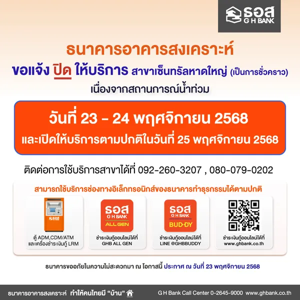 โดยสาขาและตู้ ATM ดังกล่าวจะกลับมาเปิดให้บริการตามปกติในวันอังคารที่ 25 พฤศจิกายน 2568 หรือจนกว่าจะมีประกาศเปลี่ยนแปลง