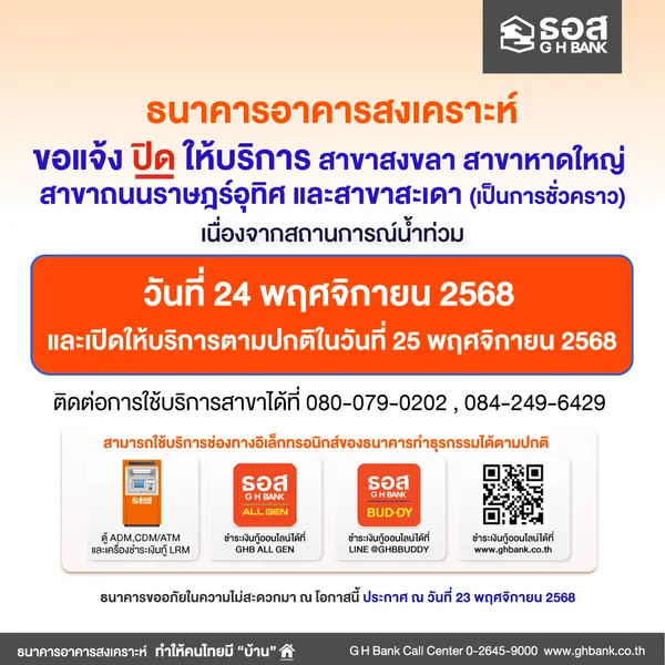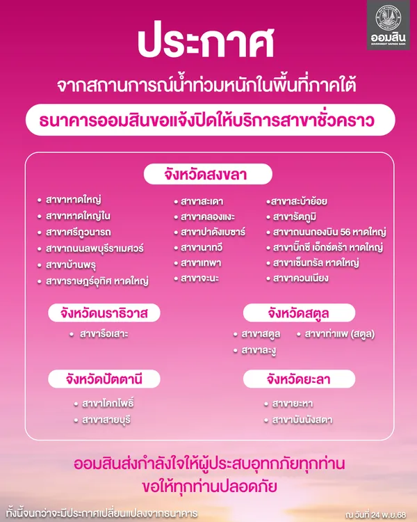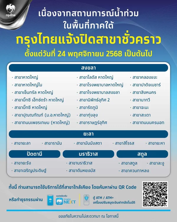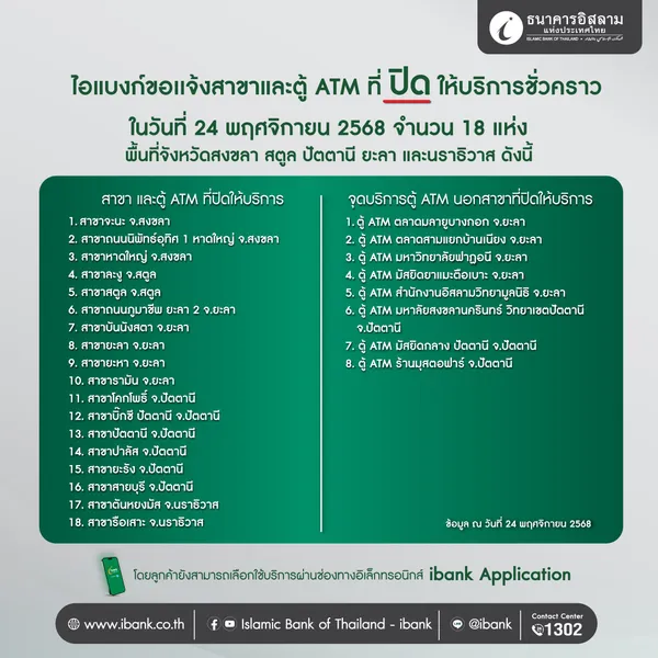 ธนาคารจึงมีความจำเป็นต้องปิดให้บริการสาขาและตู้ ATM เป็นการชั่วคราว ในวันจันทร์ที่ 24 พฤศจิกายน 2568 จำนวน 18 แห่ง ในพื้นที่จังหวัดสงขลา สตูล ยะลา ปัตตานี และนราธิวาส ดังนี้