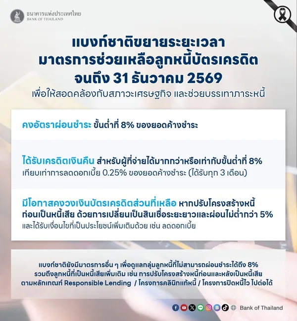 อย่างไรก็ดี ยังมีลูกหนี้กลุ่มเปราะบางที่ต้องการความช่วยเหลือเพิ่มเติม เนื่องจากรายได้ยังฟื้นตัวไม่เต็มที่ ซึ่งอาจส่งผลกระทบต่อสภาพคล่องและความสามารถในการผ่อนชำระหนี้ ในการนี้ ธปท. จึงเห็นควรขยายระยะเวลามาตรการช่วยเหลือลูกหนี้บัตรเครดิตออกไปจนถึงสิ้นปี 2569 จากเดิมที่จะมีผลสิ้นสุดในวันที่ 31 ธันวาคม 2568 โดยมีรายละเอียด ดังนี้