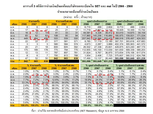 ในเดือนพฤษภาคม 2658 เป็นเดือนที่มีการจ่ายเงินปันผลมากที่สุด รวม 456 ครั้ง คิดเป็น 54.4% ของจำนวนการจ่ายเงินปันผลทั้งหมดในปี 2568 ซึ่งยังคงเป็นทิศทางเดียวกันกับปี 2567 (ตารางที่ 3) ตามมาด้วยเดือนกันยายน 2568 ที่มีการจ่ายเงินปันผลรวม 178 ครั้ง คิดเป็น 21.2% ของจำนวนการจ่ายเงินปันผลทั้งหมดในปี 2568
