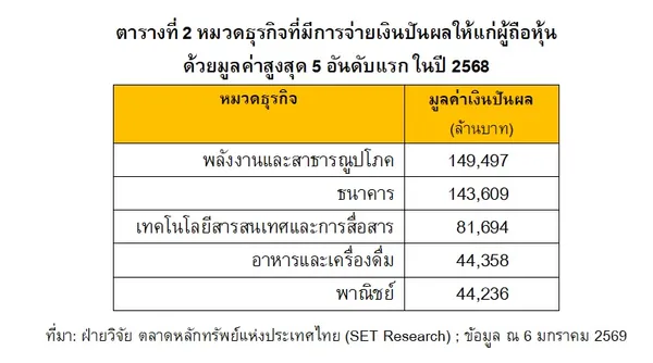 หมวดธุรกิจที่มีการจ่ายเงินปันผลด้วยมูลค่าสูงสุด 3 อันดับแรกในปี 2568 ได้แก่ หมวดพลังงานและสาธารณูปโภค หมวดธนาคาร และหมวดเทคโนโลยีสารสนเทศและการสื่อสาร