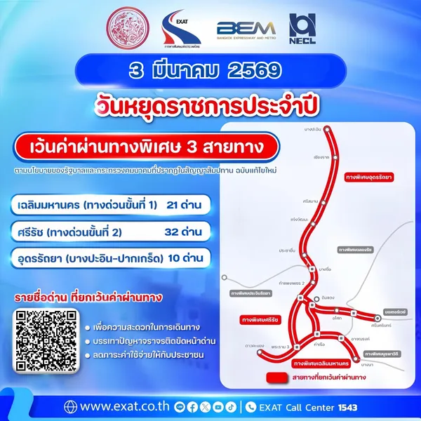 การทางพิเศษแห่งประเทศไทย (กทพ.) กระทรวงคมนาคม ประกาศแจ้ง 3 มีนาคม 2569 ยกเว้นค่าผ่านทางพิเศษ 3 สายทาง เนื่องในวันมาฆบูชา ดังนี้