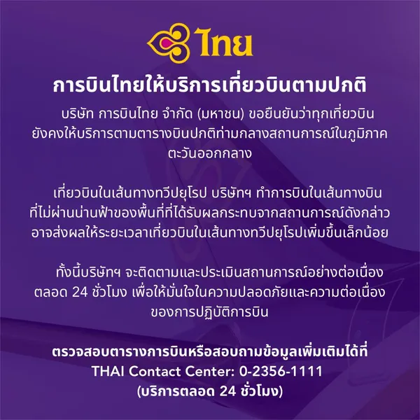 ตามที่เกิดสถานการณ์ความไม่สงบในภูมิภาคตะวันออกกลาง บริษัท การบินไทย จำกัด (มหาชน) ขอเรียนว่า เที่ยวบินของบริษัทฯ ยังคงให้บริการตามปกติ สำหรับเที่ยวบินในเส้นทางทวีปยุโรป