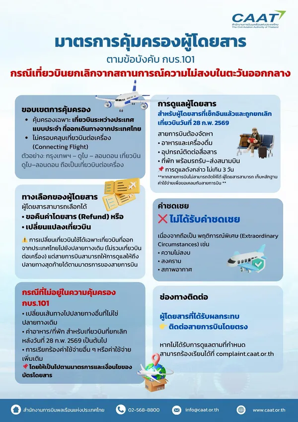 สำนักงานการบินพลเรือนแห่งประเทศไทย (CAAT) ขอแจ้งให้ผู้โดยสารทราบถึงมาตรการคุ้มครองสิทธิของผู้โดยสารตาม ข้อบังคับของคณะกรรมการการบินพลเรือน ฉบับที่ 101 สำหรับเที่ยวบินระหว่างประเทศแบบประจำที่ออกเดินทางจากประเทศไทย ซึ่งได้รับผลกระทบจากการยกเลิกเที่ยวบินจากสถานการณ์ดังกล่าว