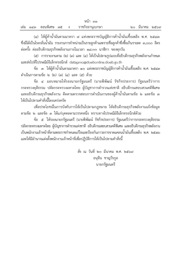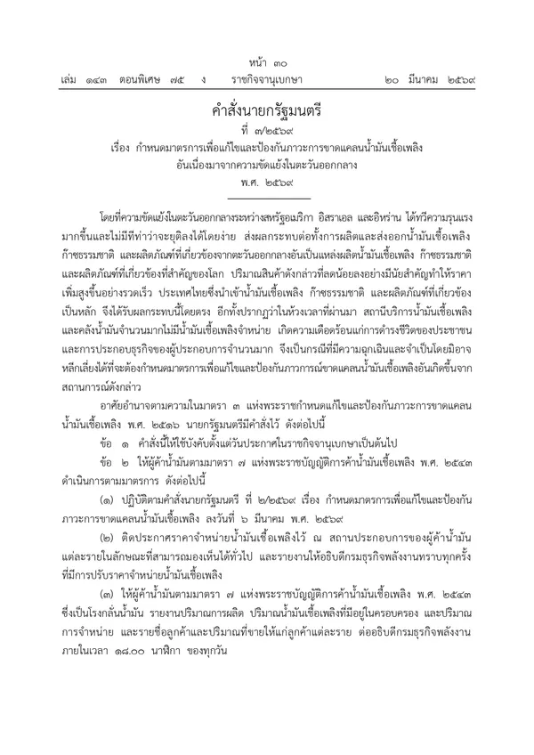 21 มีนาคม 2569 ผู้สื่อข่าวรายงานว่า เว็บไซต์ราชกิจจานุเบกษา เผยแพร่ คำสั่งนายกรัฐมนตรี ที่ 3/2569 เรื่อง กำหนดมาตรการเพื่อแก้ไขและป้องกันภาวะการขาดแคลนน้ำมันเชื้อเพลิงอันเนื่องมาจากความขัดแย้งในตะวันออกกลาง พ.ศ. 2569