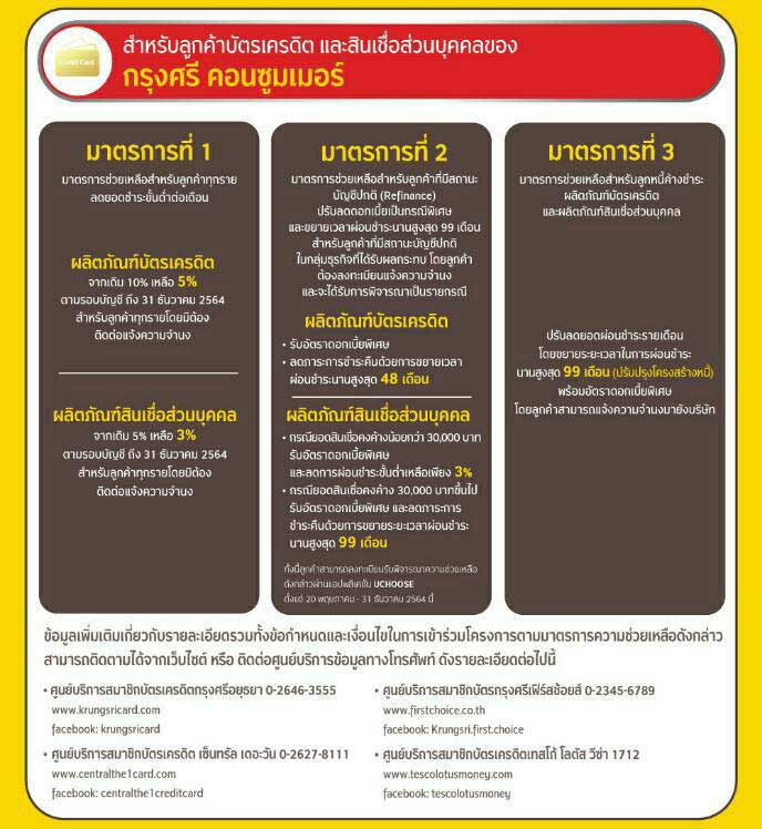 ข้อมูลเพิ่มเติมเกี่ยวกับรายละเอียด รวมทั้งข้อกำหนดและเงื่อนไขในการเข้าร่วมโครงการตามมาตรการความช่วยเหลือดังกล่าว สามารถติดตามได้จากเว็บไซต์ หรือติดต่อศูนย์บริการข้อมูลทางโทรศัพท์ ที่ศูนย์บริการสมาชิกบัตรเครดิตกรุงศรีอยุธยา 02-646-3555 www.krungsricard.com facebook: krungsricard ,ศูนย์บริการสมาชิกบัตรเครดิต เซ็นทรัล เดอะวัน 02-627-8111 www.centralthe1card.com facebook: centralthe1creditcard , ศูนย์บริการสมาชิกบัตรกรุงศรีเฟิร์สช้อยส์ 02-345-6789 www.firstchoice.co.th facebook: Krungsri.first.choice ,ศูนย์บริการสมาชิกบัตรเครดิตเทสโก้ โลตัส วีซ่า 1712 www.tescolotusmoney.com facebook: tescolotusmoney