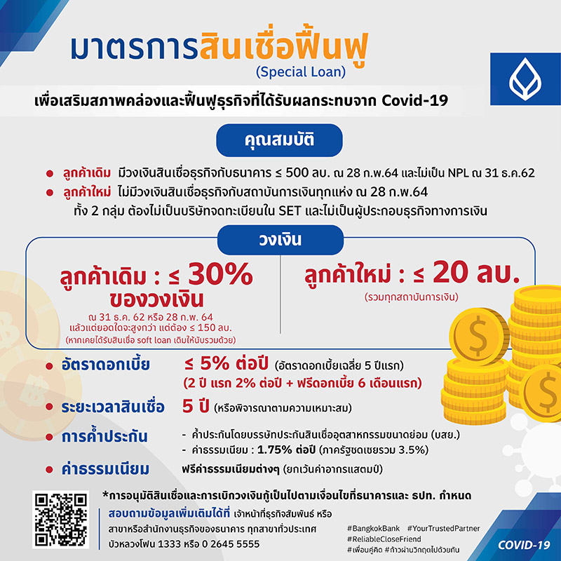 สำหรับมาตรการล่าสุดที่ ธปท. และกระทรวงการคลัง ได้ออกมา ได้แก่ มาตรการสินเชื่อฟื้นฟู เพื่อประคับประคองให้ผู้ประกอบธุรกิจที่ได้รับผลกระทบ มีสภาพคล่องสำหรับดำเนินธุรกิจ หรือเพื่อฟื้นฟูธุรกิจให้สามารถกลับมาดำเนินธุรกิจต่อได้ โดยมีเงื่อนไขที่ยืดหยุ่นและเปิดกว้าง สำหรับทั้งลูกค้าปัจจุบันที่มีวงเงินสินเชื่อธุรกิจกับธนาคารไม่เกิน 500 ล้านบาท ณ 28 กุมภาพันธ์ 2564 ซึ่งสามารถขอวงเงินสินเชื่อฟื้นฟูได้สูงสุด 30% ของวงเงินเดิม สูงสุดไม่เกิน 150 ล้านบาท (นับรวมกับวงเงิน Soft Loan เดิมที่เคยได้รับตาม พ.ร.ก.) และลูกค้าใหม่ที่ยังไม่เคยมีวงเงินสินเชื่อกับสถาบันการเงินใด สามารถขอสินเชื่อได้สูงสุด 20 ล้านบาท โดยนับรวมวงเงินจากทุกสถาบันการเงิน ในช่วง 5 ปีแรก คิดอัตราดอกเบี้ยเฉลี่ยไม่เกิน 5% ต่อปี โดยช่วง 2 ปีแรก คิด 2% ต่อปี ทั้งยังได้รับยกเว้นดอกเบี้ย 6 เดือนแรกจากการสนับสนุนของกระทรวงการคลัง ขณะเดียวกันธนาคารได้ยกเว้นค่าธรรมเนียมต่างๆ ในการขอสินเชื่อ เพื่อช่วยลดภาระผู้ประกอบธุรกิจให้ก้าวข้ามสถานการณ์ที่ยากลำบากในเวลานี้ อีกทั้ง บรรษัทประกันสินเชื่ออุตสาหกรรมขนาดย่อม (บสย.) จะเป็นผู้ค้ำประกันสินเชื่อทุกราย คิดค่าธรรมเนียมการค้ำประกันไม่เกิน 1.75% ต่อปี โดยรัฐบาลจะชดเชยค่าธรรมเนียมการค้ำประกันให้บางส่วน