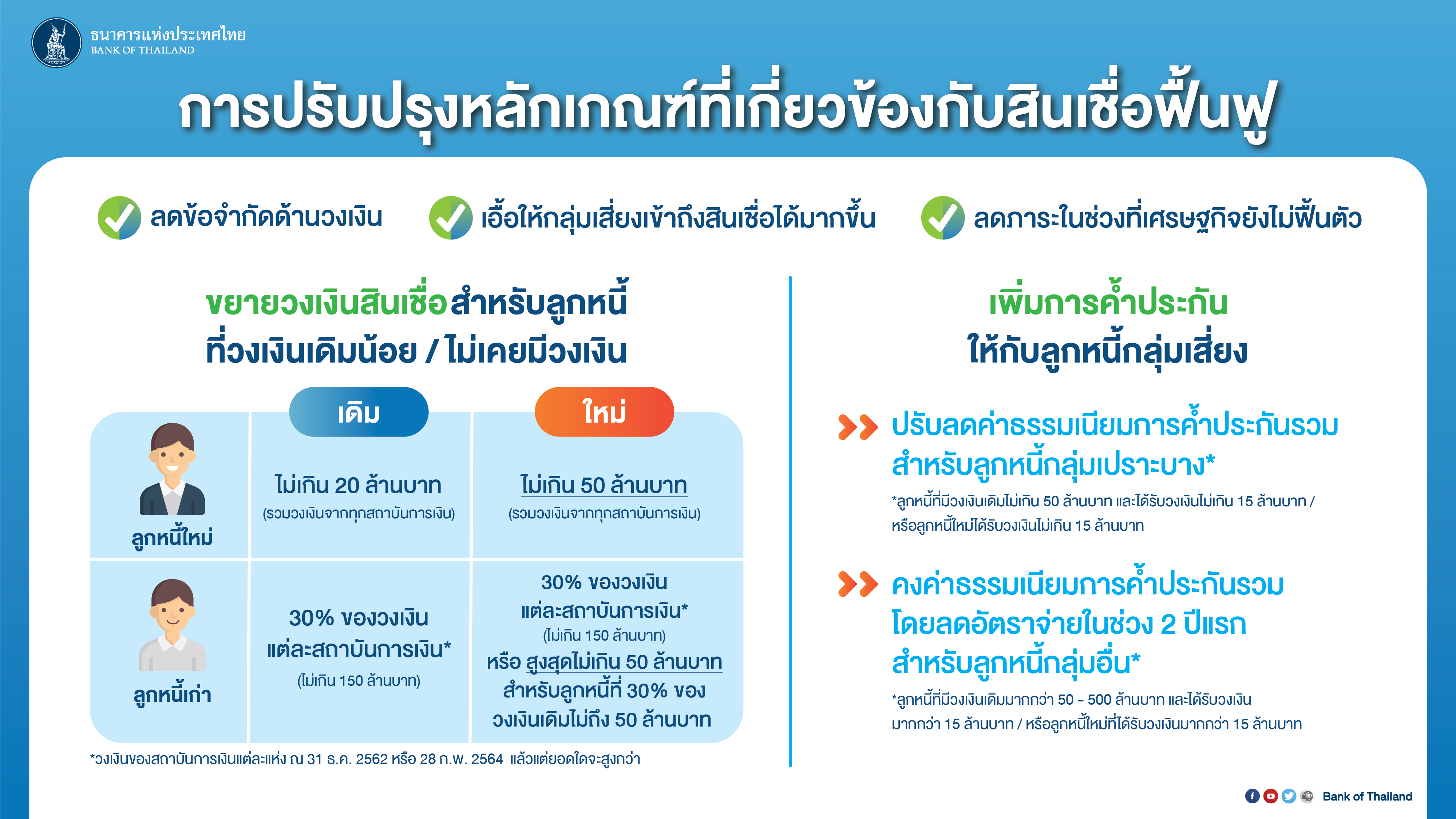 ที่ผ่านมา ธปท. ได้หารือกับผู้มีส่วนเกี่ยวข้อง ทั้งผู้ประกอบธุรกิจผ่านสมาคมต่าง ๆ เช่น หอการค้าไทย สภาหอการค้าแห่งประเทศไทย และสถาบันการเงินอย่างต่อเนื่อง เพื่อรับฟังปัญหา อุปสรรค และข้อจำกัดต่าง ๆ ของมาตรการสินเชื่อฟื้นฟู และเห็นควรให้ขยายวงเงินสินเชื่อ โดยเฉพาะกลุ่มที่มีวงเงินสินเชื่อเดิมต่ำหรือไม่เคยมีวงเงินมาก่อน ที่เดิมอาจไม่ต้องพึ่งพาสินเชื่อจากสถาบันการเงิน รวมถึงเพิ่มการค้ำประกันให้กับลูกหนี้กลุ่มเสี่ยง เพื่อให้สถาบันการเงินสามารถปล่อยสินเชื่อให้กับลูกหนี้กลุ่มเป้าหมายที่เปราะบางได้มากขึ้น