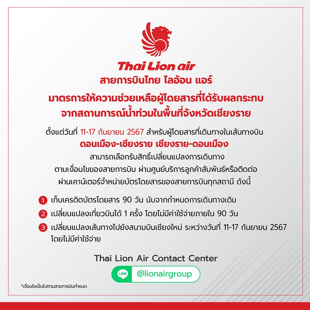 ผู้โดยสารที่ได้รับผลกระทบจากเหตุการณ์น้ำท่วมที่จังหวัดเชียงราย ที่มีกำหนดเดินทางในวันที่ 11 - 20 กันยายน 2567 ท่านสามารถรับข้อเสนอทางเลือกช่วยเหลือดังต่อไปนี้