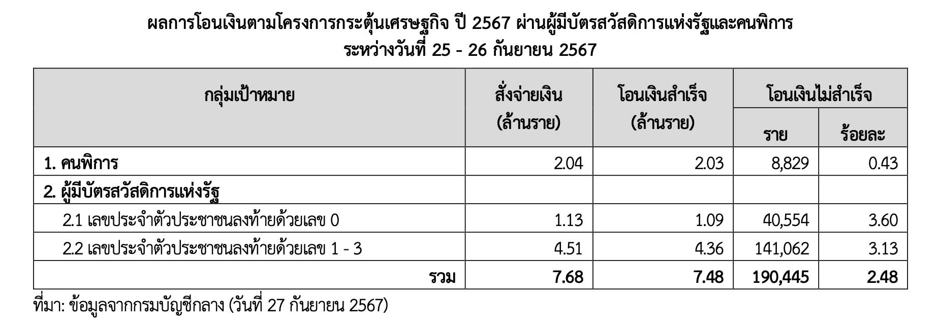 โฆษกกระทรวงการคลัง กล่าวว่า การโอนเงินเมื่อวันที่ 26 กันยายน 2567 ให้ผู้มีบัตรสวัสดิการแห่งรัฐที่มีเลขประจำตัวประชาชนลงท้ายด้วยเลข 1-3 จำนวน 4.51 ล้านราย พบว่ามีการโอนเงินไม่สำเร็จจำนวน 141,062 ราย ทำให้มียอดสะสมของการโอนเงินให้แก่กลุ่มเป้าหมายสำเร็จแล้วรวมทั้งสิ้น 7.48 ล้านราย และการโอนเงินไม่สำเร็จจำนวน 190,445 ราย
