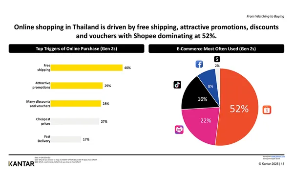ล่าสุด Kantar (คันทาร์) บริษัทวิจัยชั้นนำด้านข้อมูลเชิงลึกและที่ปรึกษาทางการตลาดระดับโลก เผยผลวิจัยฉบับใหม่ ในหัวข้อ “From Watching to Buying: Why Gen Z Are Embracing Content-Driven Shopping” ที่เจาะลึกเทรนด์การซื้อสินค้าออนไลน์ของกลุ่มผู้บริโภค Gen Z จากการสำรวจข้อมูลเชิงลึกของผู้บริโภคกลุ่ม Gen Z โดยงานวิจัยฉบับนี้เจาะลึกถึงบทบาทของคอนเทนต์และปัจจัยสำคัญที่มีอิทธิพลต่อพฤติกรรมการซื้อสินค้าออนไลน์ในประเทศไทย โดยมุ่งเน้นที่กลุ่ม Gen Z อายุระหว่าง 18–24 ปี เพื่อเป็นแนวทางสำคัญที่ช่วยให้แบรนด์และนักการตลาดสามารถปรับกลยุทธ์การสื่อสารให้สอดคล้องกับไลฟ์สไตล์และความคาดหวังของผู้บริโภครุ่นใหม่ได้อย่างมีประสิทธิภาพ